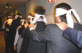 “Deze verrassende workshop was een verfrissende afwisseling van een intensieve bijeenkomst,” aldus Berry van Gool, Kantoordirecteur Tilburg. “Er was direct interactie met de zaal doordat we bij aanvang werden geblinddoekt en zo onze weg moesten vinden naar de ruimte waar de workshop werd gegeven. We werden uit onze comfortzone gehaald en moesten vertrouwen op onszelf en de omgeving.” Er werd ervaren dat het niet prettig is om de situatie niet in de hand te hebben en afhankelijk te zijn van anderen. Luttikholt: “En dat is precies wat veel werknemers voelen ten opzichte van hun organisatie of leidinggevende in tijden van grote veranderingen.” Bianca Koman, adviseur HR Development vult Van Gool aan: “Het was een mooie vertaling van de rationele onderdelen in de ochtend (macro economie en consumentenvertrouwen) naar het individu. De presentatie van Luttikholt en Erkel sloot hier mooi op aan en maakte het onderwerp persoonlijker.”